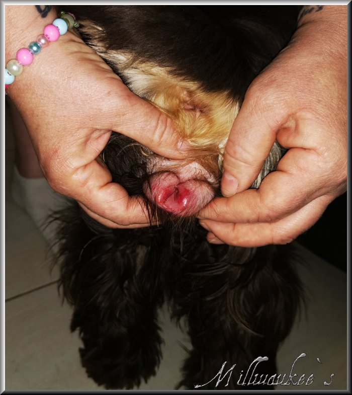 noch viel viel schlimmer war, war wie Jamaica`s Scheide aussah. Wir waren total geschockt. Unser Tierarzt musste sie auch erst einmal untersuchen ob sie überhaupt bei dieser Läufigkeit noch zum Decken war. Zum Glück waren es "nur" Hämathome ausserhalb. |