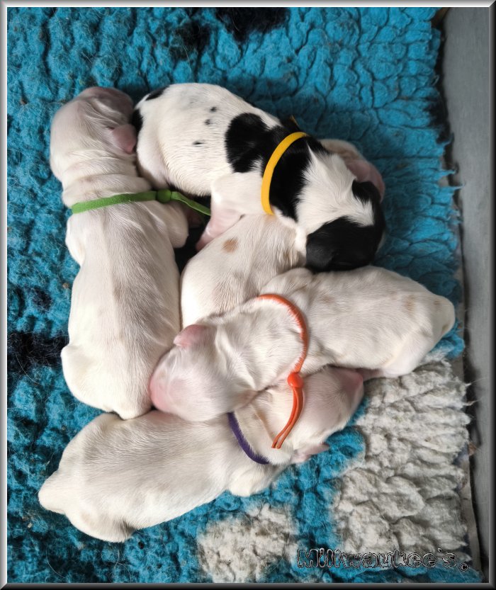 Hazy hat uns 5 stramme Welpen geschenkt. 2 Jungs und 3 Mädchen. Im Moment sieht es so aus als wären die 2 Jungs Orange-weiß, 2 der Mädchen auch Orange-weiß und 1 Mädchen in schwarz-weiß. |